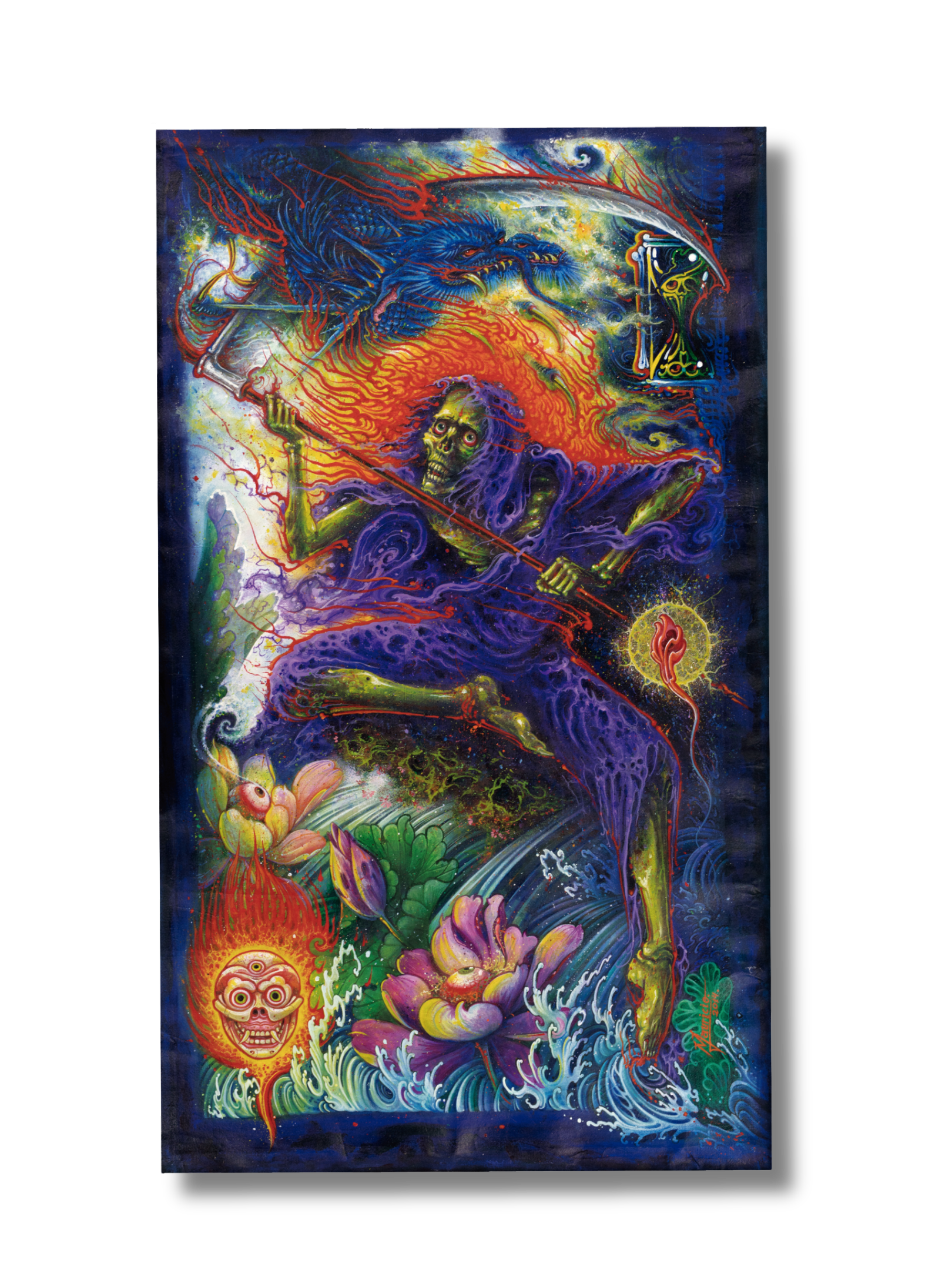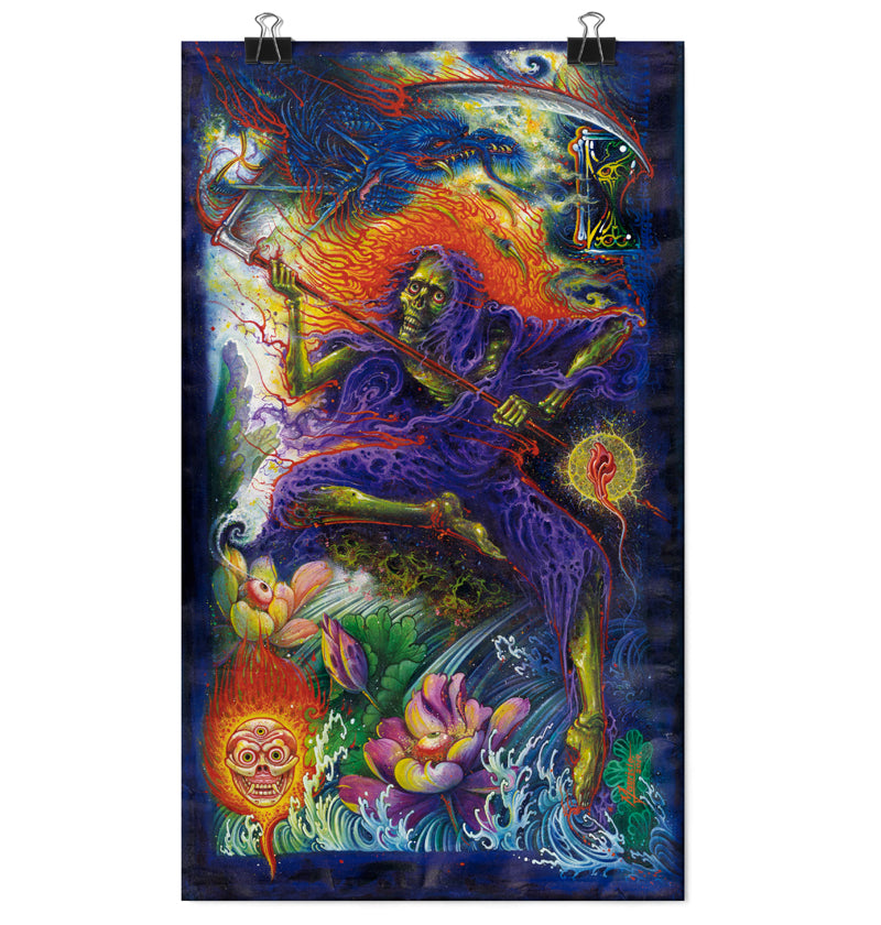 The Grim Reaper presented in a colourful and lively print by Mauricio Teodoro adds a unique spin to the traditionally grim character. Using bright colours, intricate patterns, and playful details, Teodoro managed to bring life to the otherwise dark image, creating an intriguing piece of art.